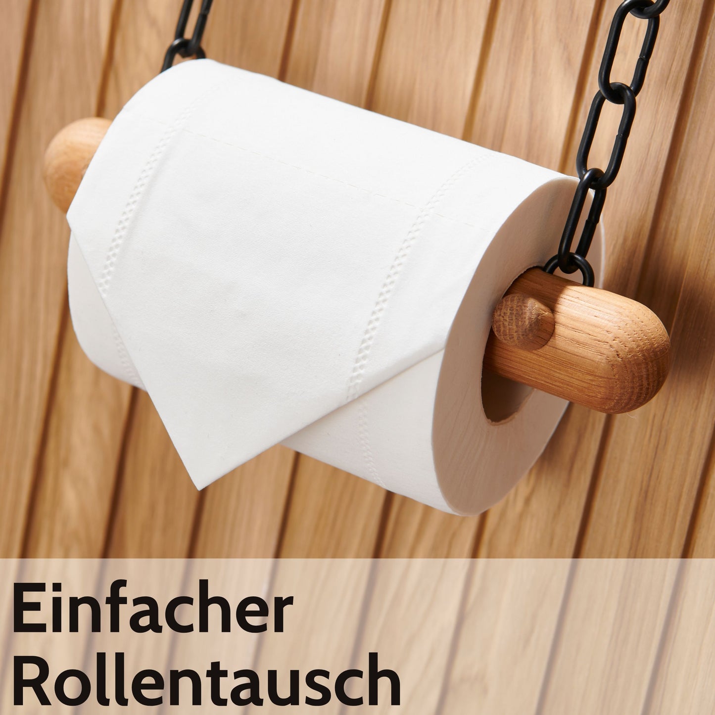 Wooden toilet roll holder with chains