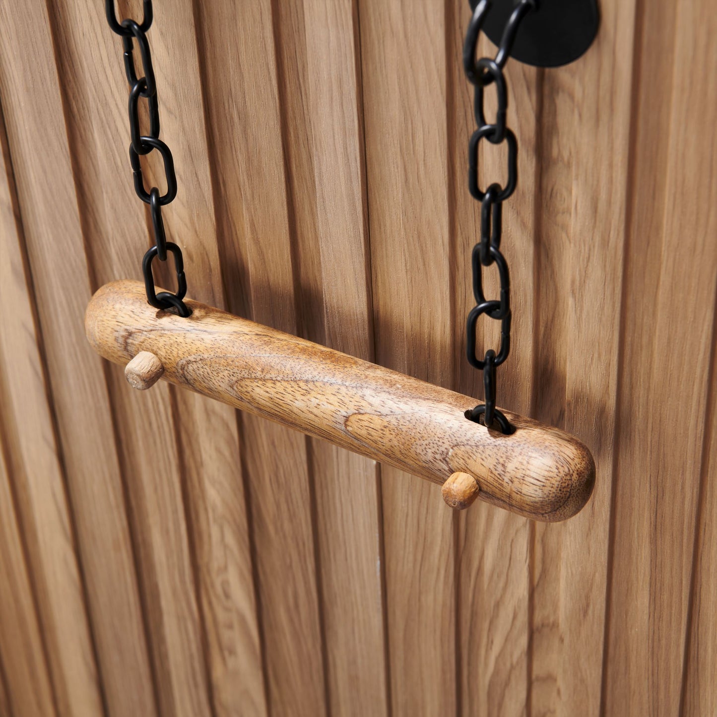 The chains and adhesive hooks are made of steel and are matt black or white. This makes them a nice complement to the natural color of the wood.